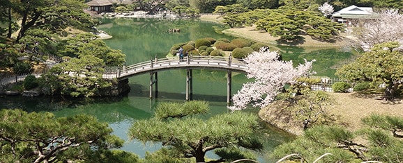 然后,我就要带您游览栗林公园。这里有二百多株姿态各异、优雅古朴的箱松,向您讲述着日本的工匠精神、展示着日本最著名的“回游式庭园”;