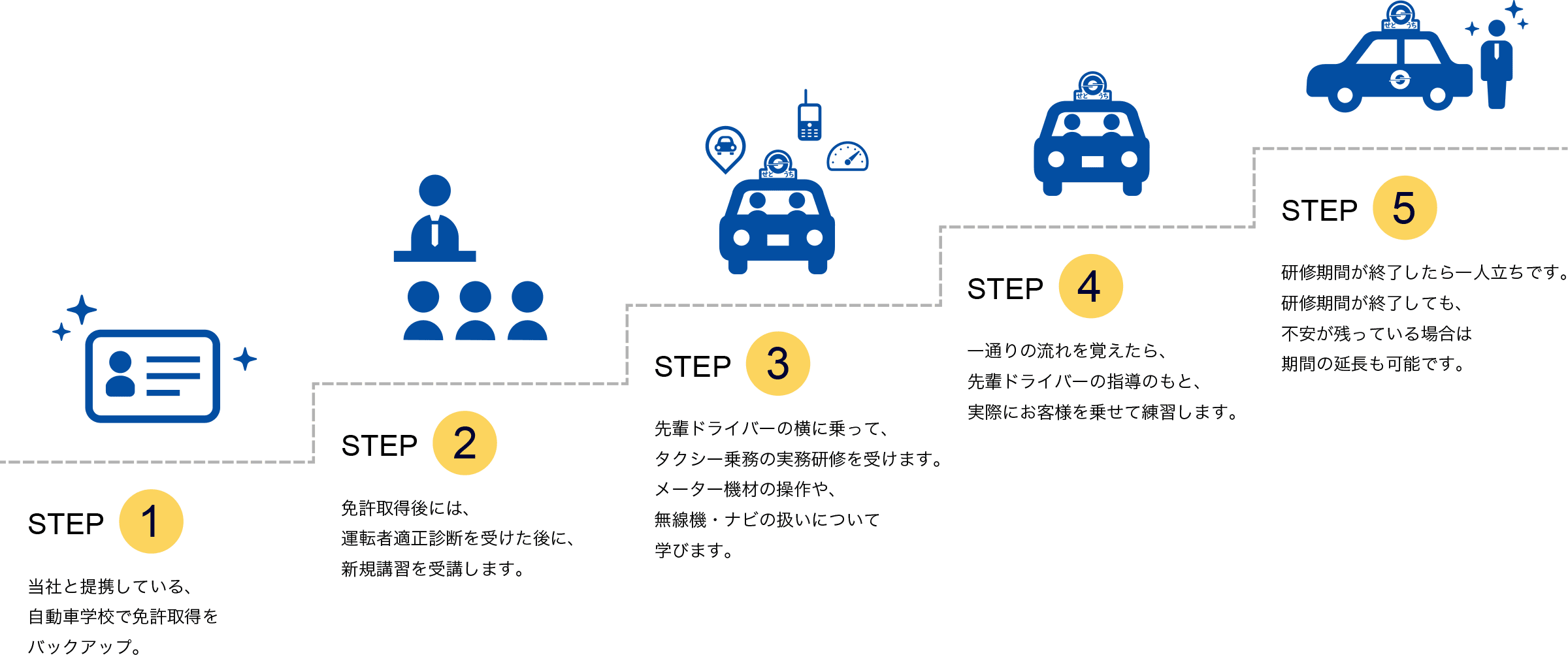 また、免許取得期間中から乗務開始までの間も、日当の支給をお約束しています。すでに乗務経験がある方は、短期間の研修のみで乗務を開始することが可能です。