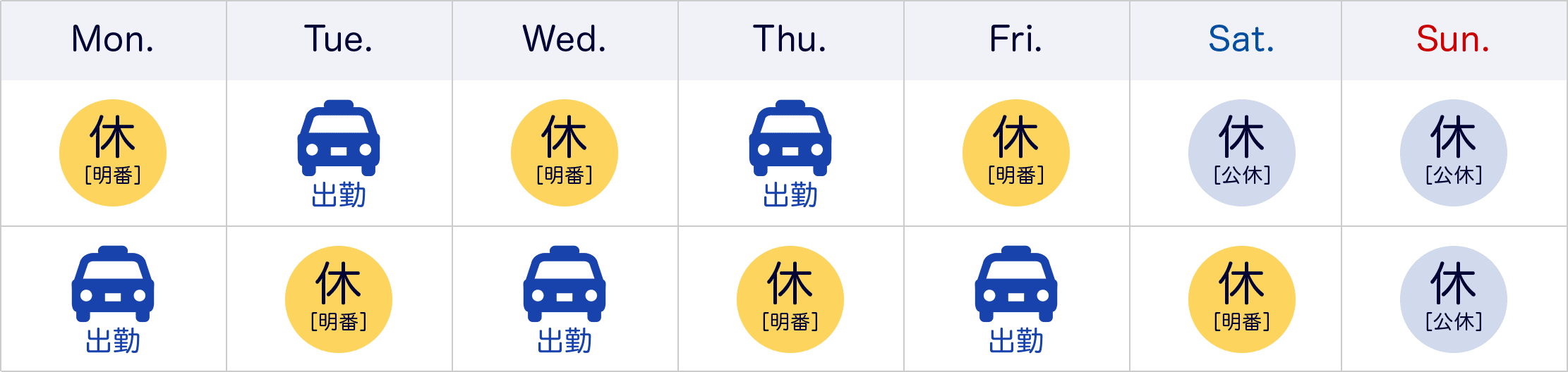 隔日勤務は、タクシーならではの勤務形態です。1日働いて、翌日は明番になるシフトのため、1ヶ月のうちの出勤回数は、わずか13回になっています。